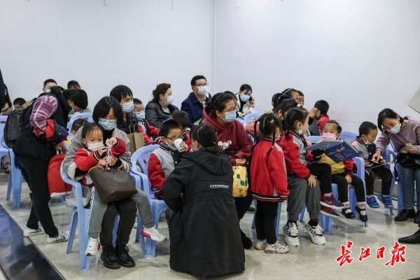 11日,武漢市金銀潭醫(yī)院新冠疫苗臨時接種點,一所幼兒園組織家長帶小朋友集體接種疫苗。 記者胡冬冬 攝