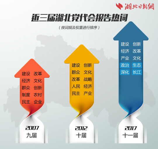 報告不僅回顧了過去5年來“五個湖北”建設和黨的建設取得豐碩成果,更開啟了湖北“建成支點、走在前列”新征程。近三屆湖北黨代會報告中哪些關鍵詞被提及次數(shù)最多?關鍵詞背后又有哪些深意?荊楚網(wǎng)絡大數(shù)據(jù)輿情中心將逐一為你解析。