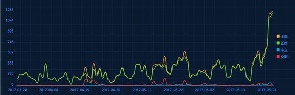 值得一提的是,荊楚網(wǎng)絡大數(shù)據(jù)輿情中心監(jiān)測發(fā)現(xiàn),今年湖北黨代會的預熱期長達約半年之久,早在2016年12月,已經(jīng)有不少與黨代會相關的信息出現(xiàn),在2017年1月的湖北省兩會期間,更是出現(xiàn)了一個輿論高峰期。而最近3個月,黨代會的相關報告也一直居高不下,各界對黨代會的關注度一直保持在一個較高的水準。6月25日,黨代會的召開將輿論情緒推向頂峰,并且還在不斷上升之中。
