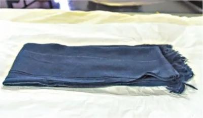 靜靜呈現(xiàn)在我們面前的,是一條灰色暗花絲織圍巾,長141厘米、寬55厘米,暗花中夾雜著五條白色絲絨,每條間隔10厘米。