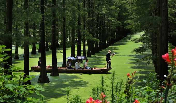 圖為:游人乘船從漲渡湖濕地水杉林中劃過 央廣網(wǎng) 發(fā) 通訊員 邱新明 攝
