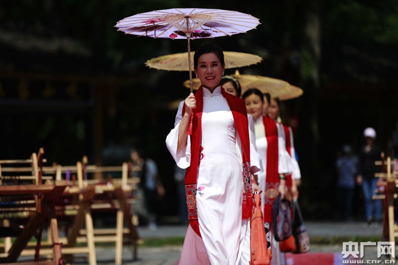 當(dāng)?shù)仄炫蹛酆谜哌現(xiàn)場(chǎng)走秀,展示了土家族織錦提包、圍巾等旅游產(chǎn)品。 -