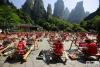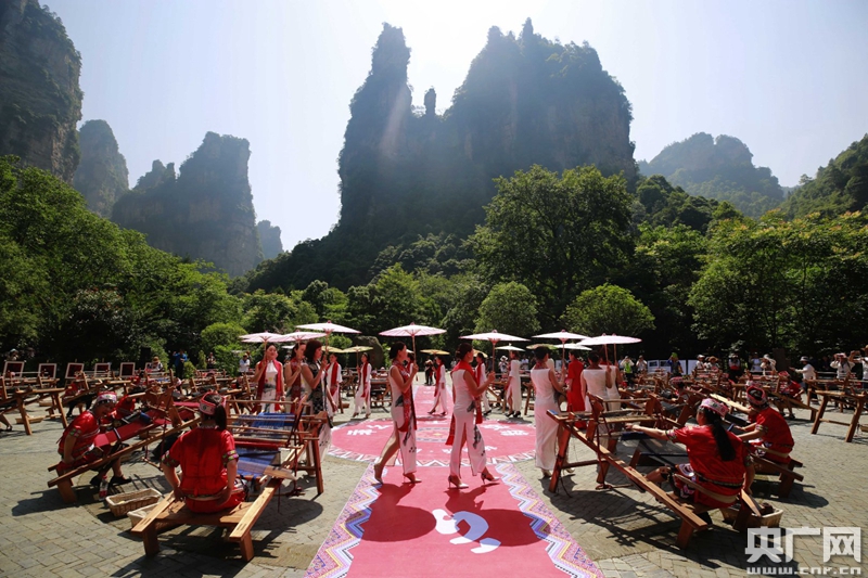 央廣網(wǎng)張家界6月8日消息(記者傅蕾 通訊員吳勇兵)在2018年“文化和自然遺產(chǎn)日”到來之際,6月7日,世界自然遺產(chǎn)地湖南張家界市在武陵源核心景區(qū)世界地質(zhì)公園博物館廣場(chǎng)舉辦土家族織錦進(jìn)景區(qū)非遺展演展示活動(dòng),近百名土家族織錦織女在峰林的見證下現(xiàn)場(chǎng)向中外游客展示張家界省級(jí)非物質(zhì)文化遺產(chǎn)土家族織錦技藝。 -
