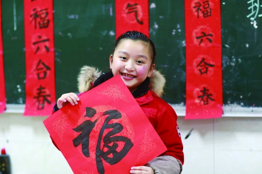 1月12日,衡陽市青少年宮,小朋友在展示、書寫“!弊趾痛郝(lián)。當(dāng)天,該青少年宮開展寫春聯(lián)、送祝;顒,讓青少年在參與中增強對春節(jié)的認(rèn)知,傳承中華優(yōu)秀傳統(tǒng)文化。