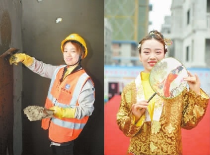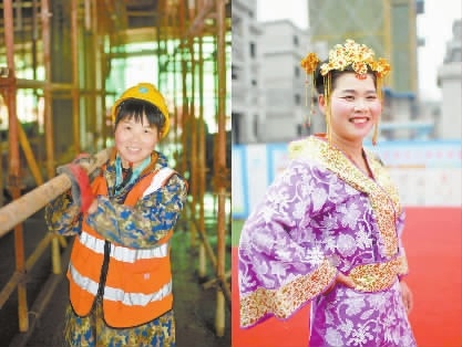 、 胡巧,27歲,泥工,來自湖北孝感,和丈夫一起在長沙縣廣悅星苑項(xiàng)目務(wù)工。圖為她著工裝和古裝的拼圖。