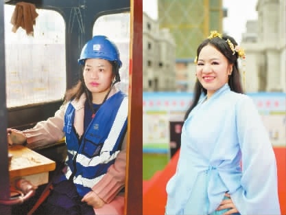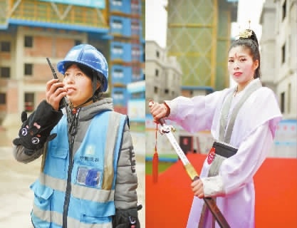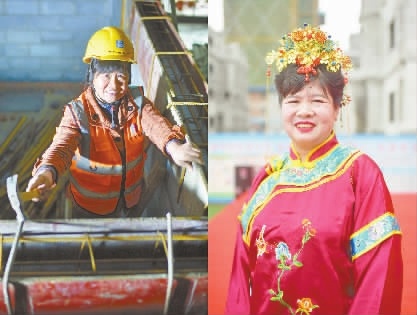 、 程金玉,31歲,塔吊指揮工,來自常德,目前在會(huì)展酒店項(xiàng)目務(wù)工。圖為她著工裝和古裝的拼圖。