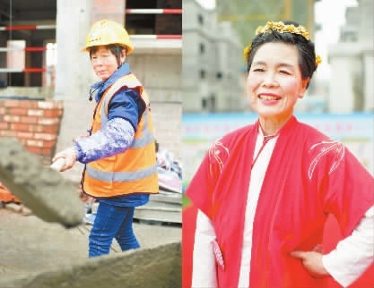 、 胡木芝,51歲,木工,來自湖北黃陂,目前在科技新城項(xiàng)目務(wù)工。圖為她著工裝和古裝的拼圖。