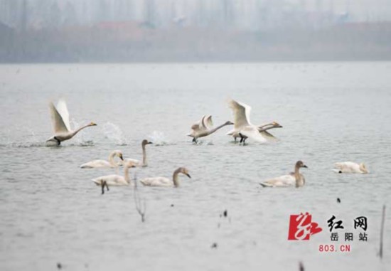 在東洞庭湖采桑湖管理站附近的湖面上,這里聚集了600多只小天鵝。記者看到,天空中還不時有三、五成群的小天鵝飛向這里,每當(dāng)有同伴到來,湖面上的天鵝就會引吭高歌表示歡迎,并不停地點頭致意。
