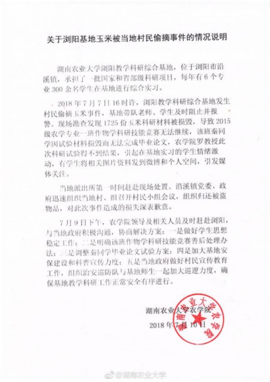 近日,湖南農(nóng)業(yè)大學許多學生反映,他們在湖南瀏陽實習基地的科研玉米頻遭附近村民偷竊,不僅損失達千萬元,且實驗數(shù)據(jù)記錄由此中斷,可能影響畢業(yè)。10日下午,湖南農(nóng)業(yè)大學針對7月7日學校瀏陽教學科研綜合基地科研玉米被偷事件發(fā)表情況說明。