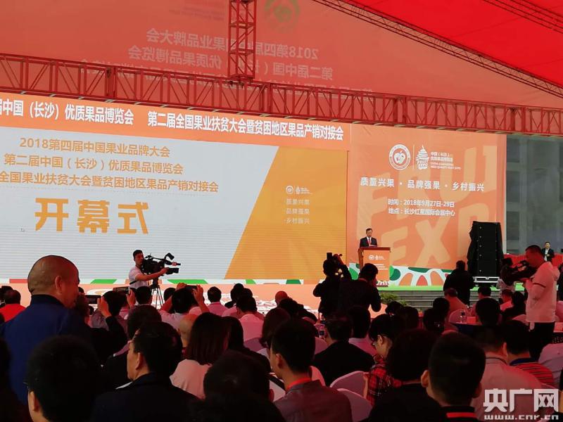 央廣網(wǎng)長沙9月27日消息(記者鄧文輝)9月27日,2018第四屆中國果業(yè)品牌大會、第二屆中國(長沙)優(yōu)質(zhì)果品博覽會、第二屆全國果業(yè)扶貧大會暨貧困地區(qū)果品產(chǎn)銷對接會(以下簡稱大會)在長沙紅星國際會展中心南廣場開幕,來自全國各地的領導嘉賓、專家學者,客商、種植大戶共同參加了開幕式,共商中國果業(yè)轉(zhuǎn)型升級、果業(yè)扶貧大計。