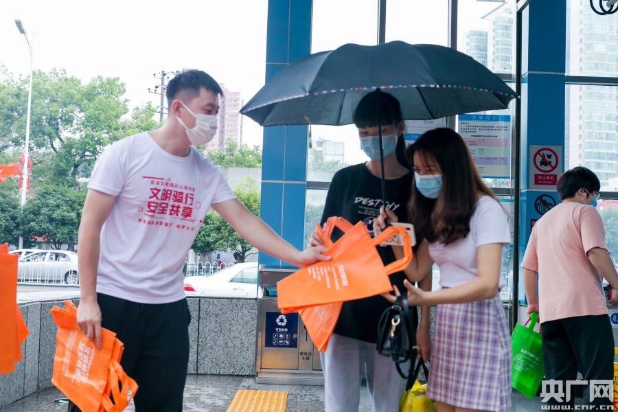 由20名志愿者組成的騎行小分隊從五一大道華美歐大廈出發(fā),吸引了很多路人的目光。盡管當天上午長沙下著雨,但絲毫沒影響到志愿者們的干勁兒。在沿線的地鐵口,志愿者向行人發(fā)放安全騎行宣傳品及倡議書。勸導小分隊的志愿者們在五一路、韶山路、解放路口,對堵塞地鐵口、消防通道、學校門口、人行道的共享單車進行了清理,并引導行人規(guī)范停車,對逆行、闖紅燈等違反交通規(guī)則的騎手進行勸誡。