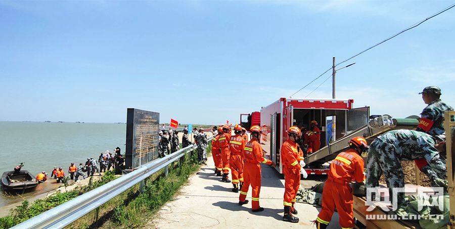 湖南省岳陽(yáng)縣中洲大堤防汛演練現(xiàn)場(chǎng)(央廣網(wǎng)記者 堯遙 攝)