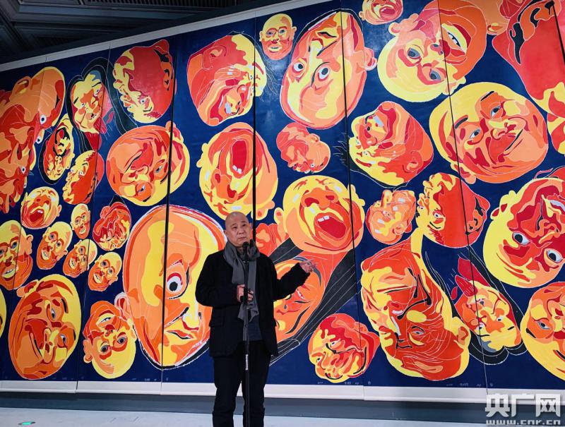 方力鈞在展覽現(xiàn)場通過直播平臺參與了簡短開幕式,其身后是他此前從未公開展出的一幅最新版畫作品(記者姜文婧 攝)