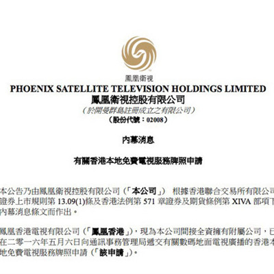 通訊局就鳳凰香港的申請(qǐng),9月23日在憲報(bào)及兩份本地報(bào)章刊登公告。通訊局表示,于今年5月6日收到鳳凰香港的免費(fèi)電視牌照申請(qǐng),并于6月至9月期間收到鳳凰香港提交的補(bǔ)充資料。通訊局公布的文件顯示,鳳凰香港現(xiàn)時(shí)是鳳凰衛(wèi)視(香港臺(tái))有限公司全資附屬公司,其母公司為鳳凰衛(wèi)視,鳳凰香港呈述將會(huì)在營(yíng)運(yùn)首六年所需經(jīng)費(fèi)估計(jì)合共為23.74億元,當(dāng)中6.23億元用于節(jié)目開支、1.31億元為資本開支,以及16.2億元為營(yíng)運(yùn)開支,而鳳凰控股會(huì)在財(cái)政上全力支持鳳凰香港的投資及營(yíng)運(yùn)。