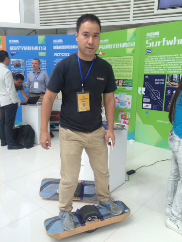 此圖為香港青年馬頌棋攜電動“陸地沖浪板”亮相