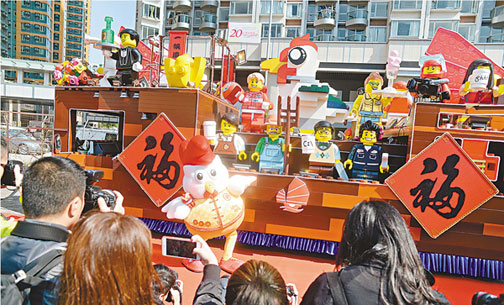 旅發(fā)局花車主題為“開年、開運、開心”,花車全由LEGO砌成,不但有“雞”、“!薄ⅰ柏斏瘛钡葌鹘y(tǒng)裝飾,還有20個代表各行各業(yè)的樂高人向市民拜年,其中“樂高雞”由22萬塊積木砌成、“財神”由8萬塊積木砌成,十分矚目。