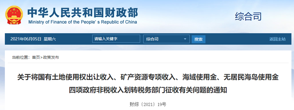 央廣網(wǎng)北京6月5日消息(記者 牛谷月)記者從財(cái)政部官網(wǎng)獲悉,6月5日,財(cái)政部、自然資源部、稅務(wù)總局、人民銀行四部門聯(lián)合發(fā)布《關(guān)于將國有土地使用權(quán)出讓收入、礦產(chǎn)資源專項(xiàng)收入、海域使用金、無居民海島使用金四項(xiàng)政府非稅收入劃轉(zhuǎn)稅務(wù)部門征收有關(guān)問題的通知》(以下簡稱《通知》)!锻ㄖ分赋,為貫徹落實(shí)黨中央、國務(wù)院關(guān)于政府非稅收入征管職責(zé)劃轉(zhuǎn)稅務(wù)部門的有關(guān)部署和要求,決定將國有土地使用權(quán)出讓收入、礦產(chǎn)資源專項(xiàng)收入、海域使用金、無居民海島使用金四項(xiàng)政府非稅收入統(tǒng)一劃轉(zhuǎn)稅務(wù)部門征收。