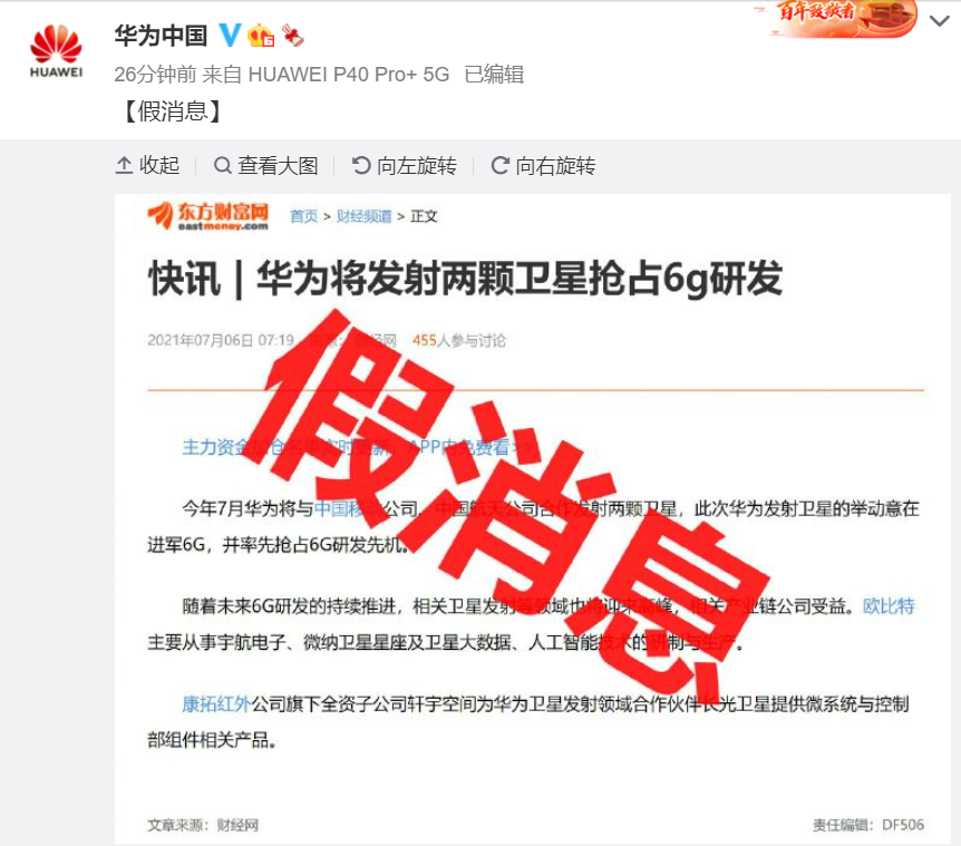 央廣網(wǎng)北京7月6日消息(記者 楊柳青)此前據(jù)媒體報道,今年7月華為將與中國移動公司、中國航天公司合作發(fā)射兩顆衛(wèi)星,此次華為發(fā)射衛(wèi)星的舉動意在進軍6G,并搶占6G研發(fā)先機。6日上午,華為中國官方微博辟謠,“華為即將發(fā)射兩顆衛(wèi)星以搶占6G研發(fā)先機”為假消息。