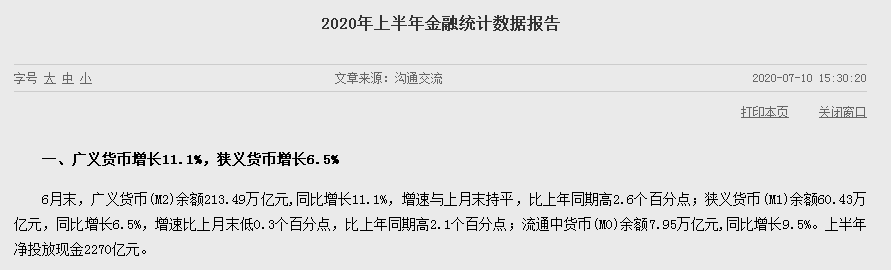 央廣網(wǎng)北京7月10日消息(記者 王雨馨)10日下午,央行網(wǎng)站公布2020年上半年金融統(tǒng)計(jì)數(shù)據(jù),6月末,廣義貨幣(M2)余額213.49萬(wàn)億元,同比增長(zhǎng)11.1%,增速與上月末持平,比上年同期高2.6個(gè)百分點(diǎn);狹義貨幣(M1)余額60.43萬(wàn)億元,同比增長(zhǎng)6.5%,增速比上月末低0.3個(gè)百分點(diǎn),比上年同期高2.1個(gè)百分點(diǎn);流通中貨幣(M0)余額7.95萬(wàn)億元,同比增長(zhǎng)9.5%。上半年凈投放現(xiàn)金2270億元。