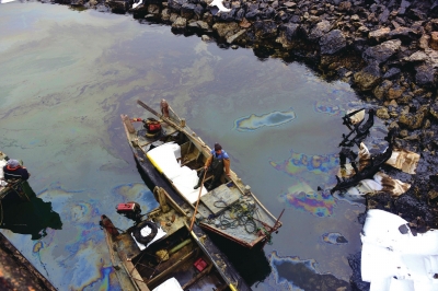 這時,我接到安全科長的一個電話說,海邊溢油現(xiàn)象嚴(yán)重。因此,我立即趕往海邊參加處置。到海邊大約8點40分,看見地方相關(guān)部門的人員也陸續(xù)前來,包括安監(jiān)、環(huán)保、海事和市政的人,穿著樣式不同的服裝。