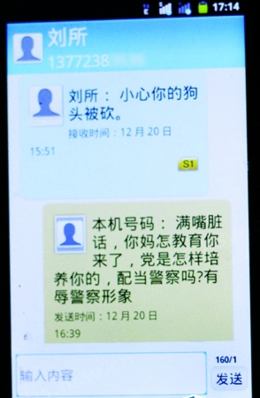 帖子中還附有一張手機(jī)短信對話的照片,照片顯示,該手機(jī)在12月20日15點(diǎn)51分收到一條來自通訊錄名字為“劉所”的短信:“小心你的狗頭被砍!50分鐘后,該手機(jī)回復(fù):“滿嘴臟話,你媽怎教育你來了,黨是怎樣培養(yǎng)你的,配當(dāng)警察嗎?有辱警察形象!