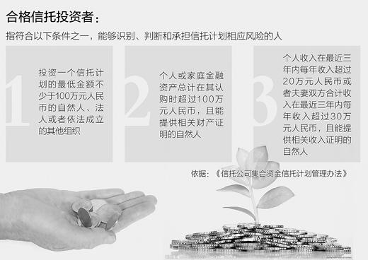 合格投資者的標(biāo)準(zhǔn),按照《信托公司集合資金信托計(jì)劃管理辦法》規(guī)定,分為三類:一、投資一個(gè)信托計(jì)劃的最低金額不少于100萬元人民幣的自然人、法人或者依法成立的其他組織;二、個(gè)人或家庭金融資產(chǎn)總計(jì)在其認(rèn)購時(shí)超過100萬元人民幣,且能提供相關(guān)財(cái)產(chǎn)證明的自然人;三、個(gè)人收入在最近三年內(nèi)每年收入超過20萬元人民幣或者夫妻雙方合計(jì)收入在最近三年內(nèi)每年收入超過30萬元人民幣,且能提供相關(guān)收入證明的自然人。