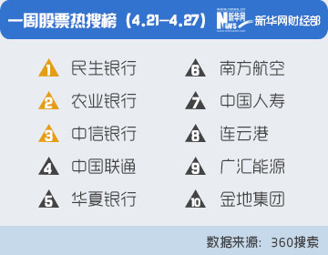 360搜索數(shù)據(jù)顯示,截至2014年4月27日,入選一周股票熱搜榜前10位的上市公司依次為:民生銀行、農(nóng)業(yè)銀行、中信銀行、中國(guó)聯(lián)通、華夏銀行、南方航空、中國(guó)人壽、連云港、廣匯能源和金地集團(tuán)。