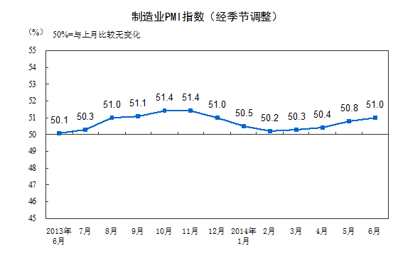 2014年6月,中國(guó)制造業(yè)采購(gòu)經(jīng)理指數(shù)(PMI)為51.0%,比上月上升0.2個(gè)百分點(diǎn),連續(xù)4個(gè)月回升,表明制造業(yè)延續(xù)了平穩(wěn)增長(zhǎng)的良好勢(shì)頭。