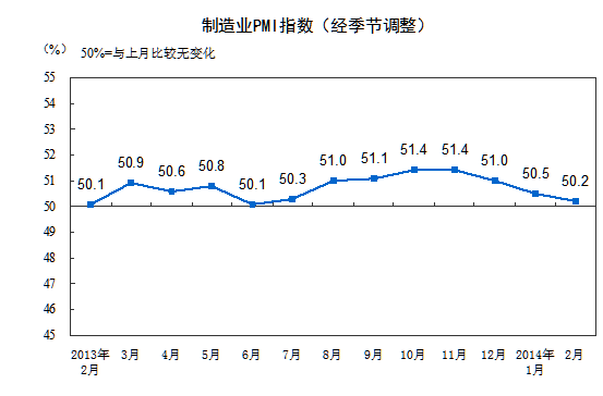 2014年2月中國制造業(yè)采購經(jīng)理指數(shù)為50.2%