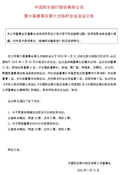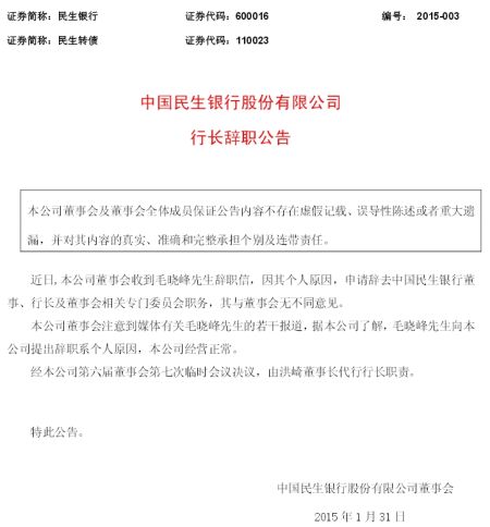 民生銀行公告毛曉峰已辭職 行長(zhǎng)職責(zé)由洪崎代行
