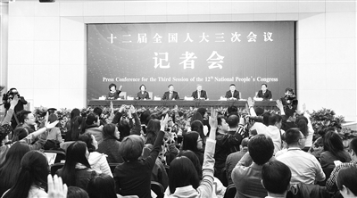 3月12日下午,十二屆全國人大三次會議新聞中心舉行記者會。圖為記者會現(xiàn)場。本報記者 李樹貴攝