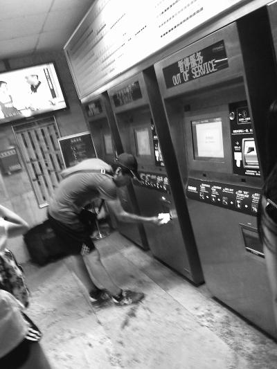 在B進(jìn)站口處,有一名專(zhuān)門(mén)負(fù)責(zé)從售票機(jī)買(mǎi)票的戴帽子男子,他先是混在人群里,到人工售票口排隊(duì)買(mǎi)票,但并沒(méi)有從售票窗口買(mǎi)出票來(lái),于是他到自動(dòng)售票機(jī)前,先用一些硬幣買(mǎi)出幾張票,又拿出一張紙幣投進(jìn)去,但是嘗試了幾次都沒(méi)買(mǎi)出票。這時(shí)候,一名大個(gè)子地鐵工作人員向他大喊,男子馬上跑向站外。