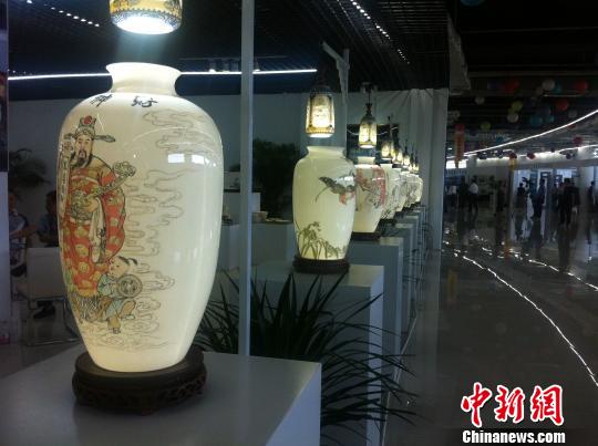 圖為展區(qū)內(nèi)精美的斗彩瓷器吉祥瓶。 李飛 攝