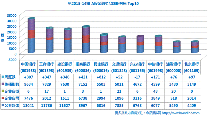 在A股金融類品牌指數(shù)榜中,前三甲為中國銀行、工商銀行、建設銀行,傳播指數(shù)分別是9634、7829和7630,環(huán)比上漲307、347和346點,該榜單中僅有興業(yè)銀行一家企業(yè)出現(xiàn)17點的小幅下跌,其他企業(yè)尤其是前五位的企業(yè)增幅相差不大。