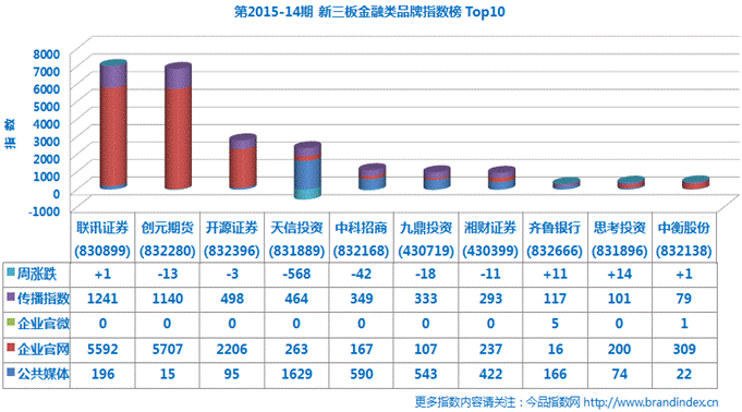 新三板金融類品牌企業(yè)在這一周表現(xiàn)不佳,僅有四家企業(yè)出現(xiàn)微弱增長。該榜單中第一名聯(lián)訊證券的傳播指數(shù)為1241點、上漲了1點;第二名創(chuàng)元期貨為1140點、下降了13點;第三名開源證券498點,下降了3點。該榜單中天信投資連續(xù)兩周成為下跌幅度最大的企業(yè),下跌568點。