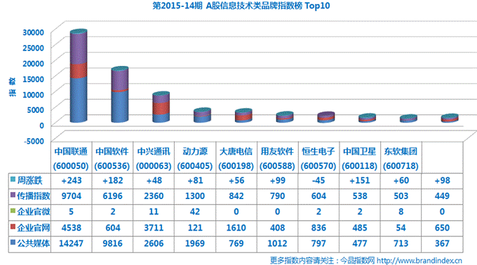 而A股信息技術類品牌指數(shù)榜呈現(xiàn)一片上揚行情。前三名分別是中國聯(lián)通、中國軟件和中興通訊。中國聯(lián)通影響指數(shù)為9704點,環(huán)比增長243點;第二位中國軟件影響指數(shù)為6196點、環(huán)比增長182點;第三位中興通訊2360點,環(huán)比增長48點。