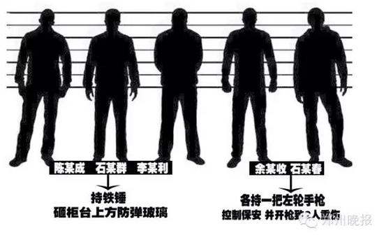 具體的分工是:余某收和石某春各持一把左輪手槍,負責控制值班的保安,并開了槍。石某群回憶,李某利和陳某成負責砸防彈玻璃,各砸了一個洞口,他接著砸,不到一分鐘玻璃砸開了,他們迅速鉆進入營業(yè)室用編織袋搶錢。