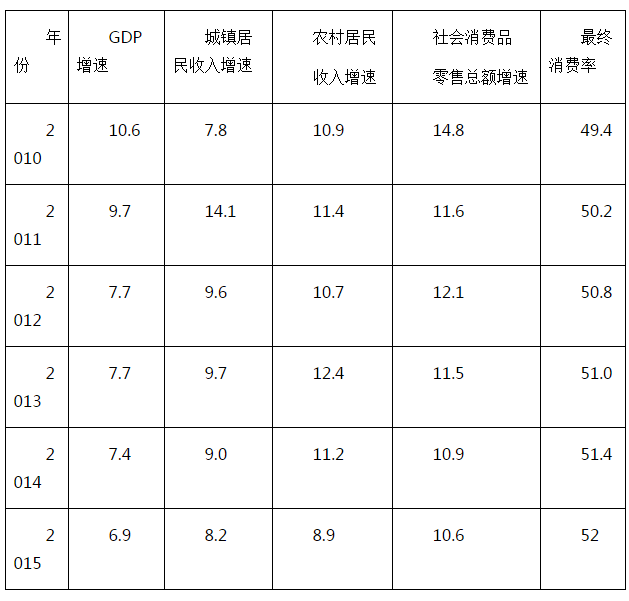 在經(jīng)濟行為中,隨著收入提高,居民的邊際消費傾向遞減規(guī)律會表現(xiàn)出來,是否預(yù)示中國居民消費支出比重會下降呢。目前中國絕大多數(shù)城鄉(xiāng)居民近90%左右均以勞動收入為主,隨著社會保障體系日臻健全,我國居民絕對消費支出仍然會快速增長。從表1可以看出,2010—2015年,我國社會消費品零售總額增速整體快于GDP和居民收入增速,近幾年基本穩(wěn)定在11%左右的快速增長區(qū)間。即使在宏觀經(jīng)濟速度下行的2015年,社會消費品零售總額也穩(wěn)步增長10.6%,沒有明顯的滑落。