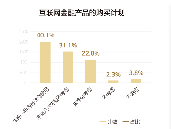 在互聯(lián)網(wǎng)金融深入千家萬(wàn)戶的潮流之下,調(diào)查發(fā)現(xiàn):在未來(lái)一年內(nèi),有多達(dá)40.06%的大學(xué)生有意愿購(gòu)買互聯(lián)網(wǎng)金融(服務(wù))。還有22.75%的大學(xué)生選擇了“未來(lái),等互聯(lián)網(wǎng)發(fā)展成熟之后,會(huì)考慮使用互聯(lián)網(wǎng)金融產(chǎn)品(服務(wù))”。