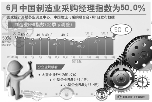 今天上午,國家統(tǒng)計局發(fā)布了今年6月份中國制造業(yè)采購經(jīng)理人指數(shù)PMI數(shù)值為50.0%,比上月微降0.1個百分點,位于臨界點。