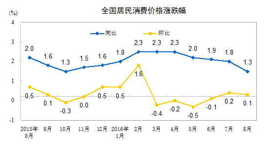 2016年8月份,全國居民消費(fèi)價(jià)格總水平同比上漲1.3%。其中,城市上漲1.4%,農(nóng)村上漲1.0%;食品價(jià)格上漲1.3%,非食品價(jià)格上漲1.4%;消費(fèi)品價(jià)格上漲0.9%,服務(wù)價(jià)格上漲2.1%。