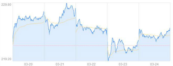 就在騰訊財報發(fā)布的當天,股票就開始下跌,當日收盤時股價為225.2港元,下跌了3.6港幣,跌幅為1.57%。第二天繼續(xù)下跌,開盤時僅為221.80港元,收盤時雖回升至223,但還是比前一個交易日下跌了2.2港元,跌幅為0.98%。連跌兩天之后,終于在24日止跌回升,收盤時達到225.2,比前一個交易日上漲了0.99%。