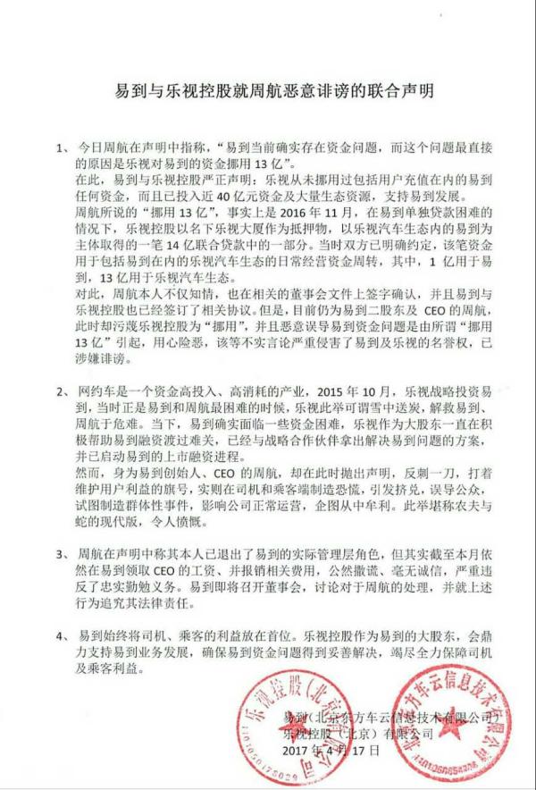 這份聯(lián)合聲明中,蓋上了樂視控股和易到運營主體北京東方車云信息技術(shù)有限公司的紅色印章。