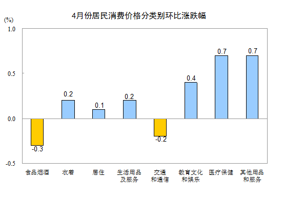 4 月份,全國居民消費價格總水平環(huán)比上漲 0.1% 。其中,城市上漲 0.1% ,農(nóng)村持平;食品價格下降 0.6% ,非食品價格上漲 0.2% ;消費品價格下降 0.1% ,服務(wù)價格上漲 0.4% 。