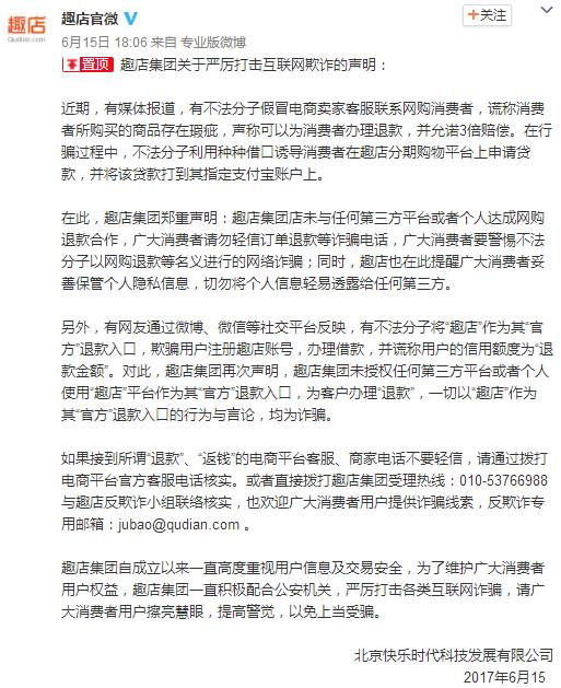 隨后,該網(wǎng)友指出的“趣店集團”,官微作出相關聲明: