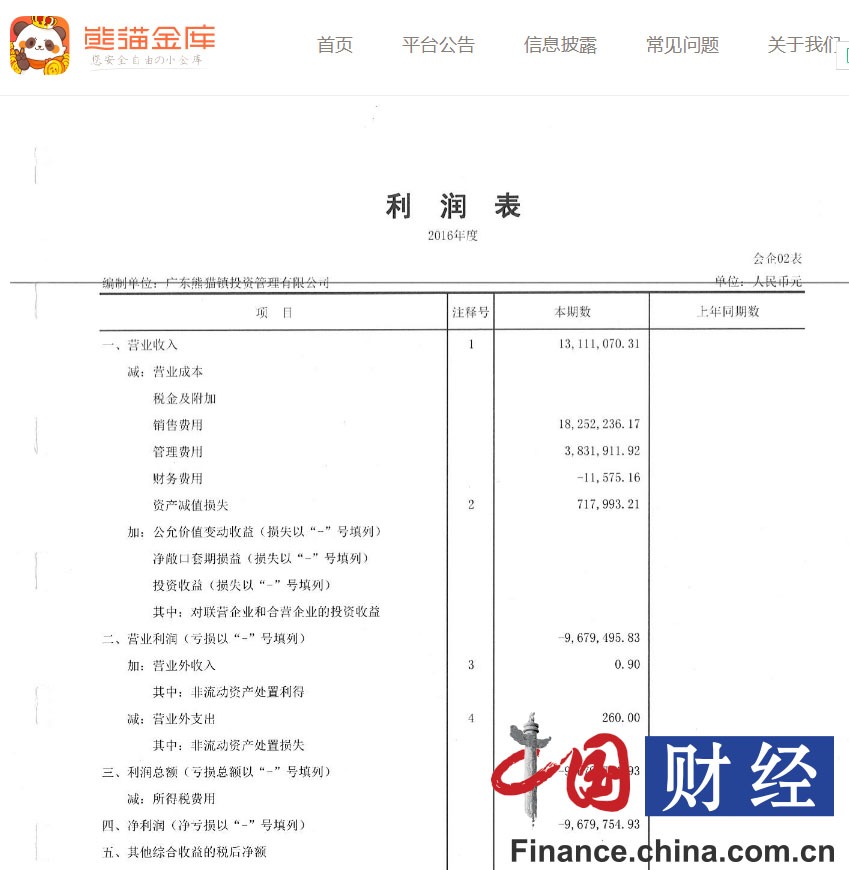 中國網(wǎng)財(cái)經(jīng)記者發(fā)現(xiàn),在亮眼的成交數(shù)據(jù)背后,熊貓金庫卻面臨虧損。據(jù)其官方網(wǎng)站披露的《廣東熊貓鎮(zhèn)投資管理有限公司2016年度審計(jì)報(bào)告》(以下簡稱“審計(jì)報(bào)告”)顯示,2016年熊貓金庫營業(yè)收入為1311.11萬元,凈利潤為-967.96萬元。