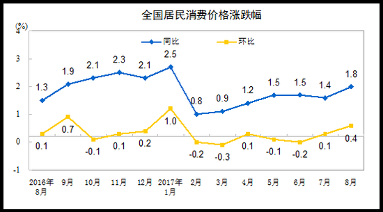 2017年8月份,全國居民消費(fèi)價(jià)格同比上漲1.8%。其中,城市上漲1.9%,農(nóng)村上漲1.5%;食品價(jià)格下降0.2%,非食品價(jià)格上漲2.3%;消費(fèi)品價(jià)格上漲1.0%,服務(wù)價(jià)格上漲3.1%。1-8月平均,全國居民消費(fèi)價(jià)格總水平比去年同期上漲1.5%。