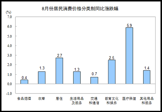 8月份,其他七大類價(jià)格同比均有所上漲。其中,醫(yī)療保健、居住、教育文化和娛樂價(jià)格分別上漲5.9%、2.7%和2.5%,其他用品和服務(wù)價(jià)格上漲1.4%,衣著、生活用品及服務(wù)價(jià)格均上漲1.3%,交通和通信價(jià)格上漲0.7%。