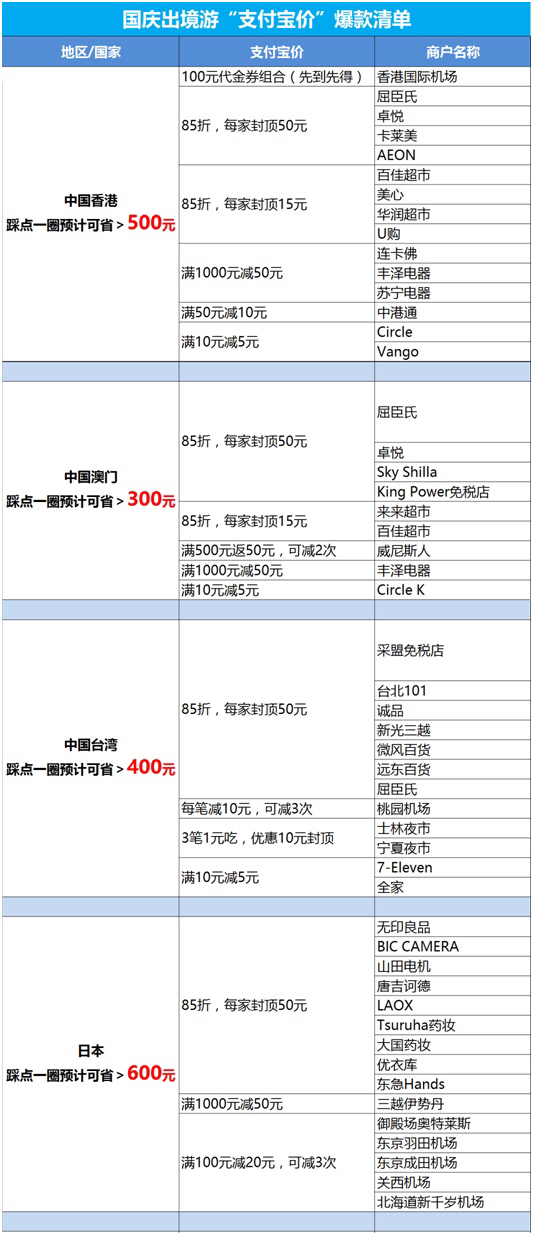 以港澳臺、日韓、以泰國、新加坡為代表的東南亞各國,素來是中國人出境游的熱門目的地。據(jù)統(tǒng)計,在這些國家和地區(qū),國人最常去的商家中,起碼有超過七成的商家,都向中國游客推出支付寶價。每家每鋪的優(yōu)惠力度各不相同,最主流的方式就是八五折(50元封頂),且不同品牌店鋪之間的優(yōu)惠可以疊加。
