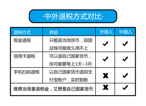 現(xiàn)金退稅是退回當?shù)刎泿,最大的問題是當?shù)貛艓Щ貒赡軙䶮o用武之地;而信用卡退稅,游客可以拿到自己國家的貨幣,但是,一般要等候三五天時間,不像現(xiàn)金退稅這樣可以當場“落袋為安”,用手機退稅一秒到賬,收到的是人民幣。